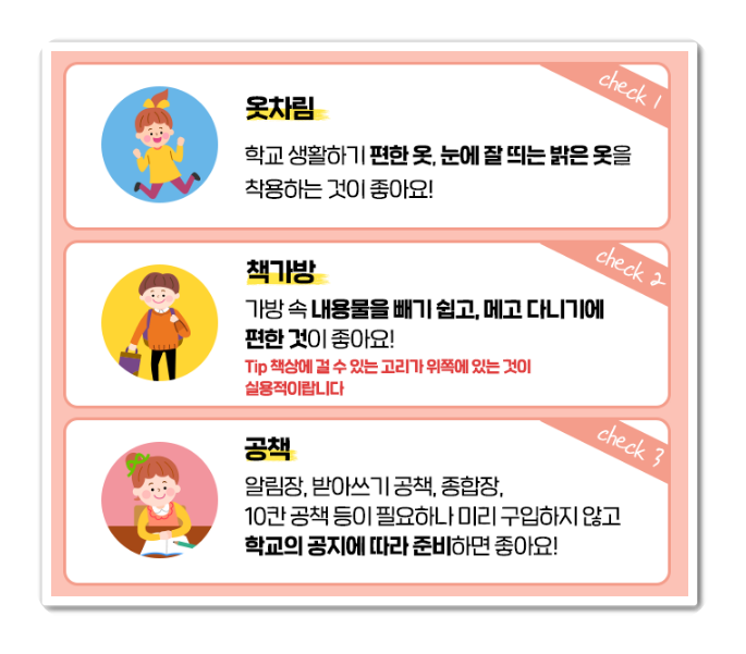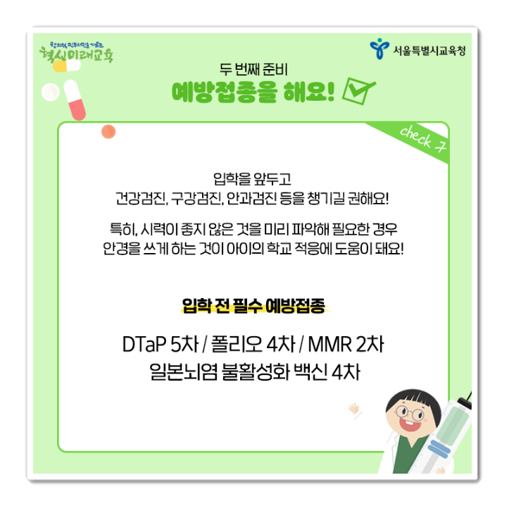 여섯번째는 예방접종입니다. 입학을 앞두고 아이들의 건강검진은 필수호 해야합니다. 건강검진, 구강검진, 안과 검진등 챙셔서 검사해야지 좋습니다. 만약에 시력이 안좋다면 안경을 쓰게 하는것이 아이에게 학교 적응하는데 도움이 됩니다.
