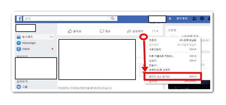 두번째, 페이스북 로그인을 했다면 자신의 타임라인을 확인뒤에 자신의 타임라인이 가지고 있는 소스를 활용해야 하기 때문에 타임라인에 CTRL+U 또는 마우스 오른쪽을 눌러서 페이스 소스보기를 해주세요. 그러면 페이스 소스가 보일겁니다.