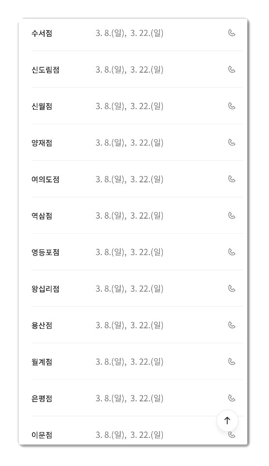도곡, 청담, 가든5, 가양, 구로, 강남대치, 강남삼성, 강남세곡, 강남역삼, 강남터미널