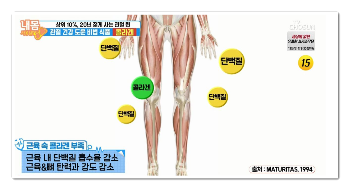 근육 내 콜라겐이 무족할 경우 근육내 단백질 흡수율이 감소하며 근육과 뼈의 탄력과 강도 역시 감소하는것으로 나왔습니다. 또한, 류머티즘 관절염 환자 60명을 대상으로 한 실험에서 3주간 콜라겐을 섭취햇을경우 60명중 4명은 완치하고, 56명은 개선되는 효과를 나타냈습니다.