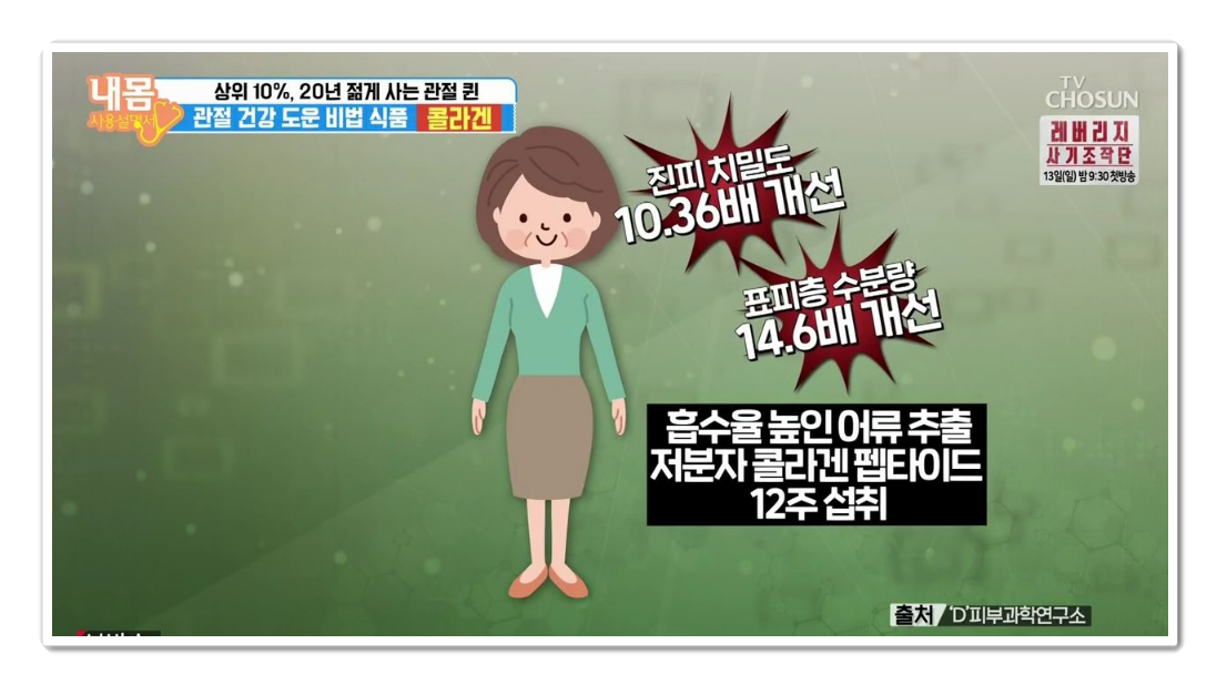 모 피부과학연구소에서는 흡수율을 높인 어류추출 저분자 콜라겐 펩타이드를 12주간 섭취했을때 진피층의 치밀도가 10.36배 개선되었고 표피층의 수분량이 14.6배 이상 개선되었다고합니다.