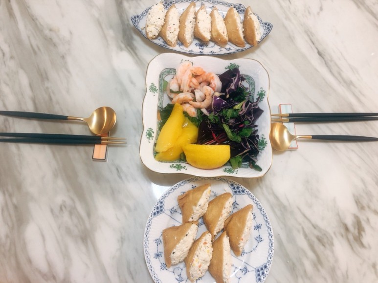 유부초밥과 코스트코에서 구매했던 시트러스 쉬림프 샐러드로 완성!