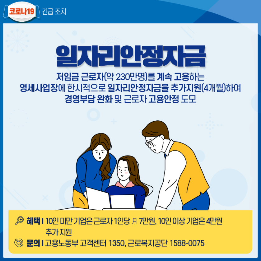 - 저임금 근로자(약 230만명)를 계속 고용하는 영세사업장에 한시적으로 일자리 안정자금을 추가지원(4개월)하여 경영부담 완화 및 근로자 고용안정을 도모합니다.