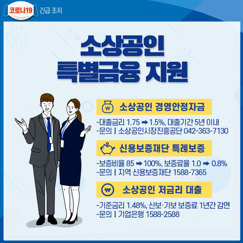 - 소상공인 경영안정자금 : 대출금리 1.75 -> 1.5%, 대출기간 5년이내 / 소상공인시장진흥공단 (042-363-7130)