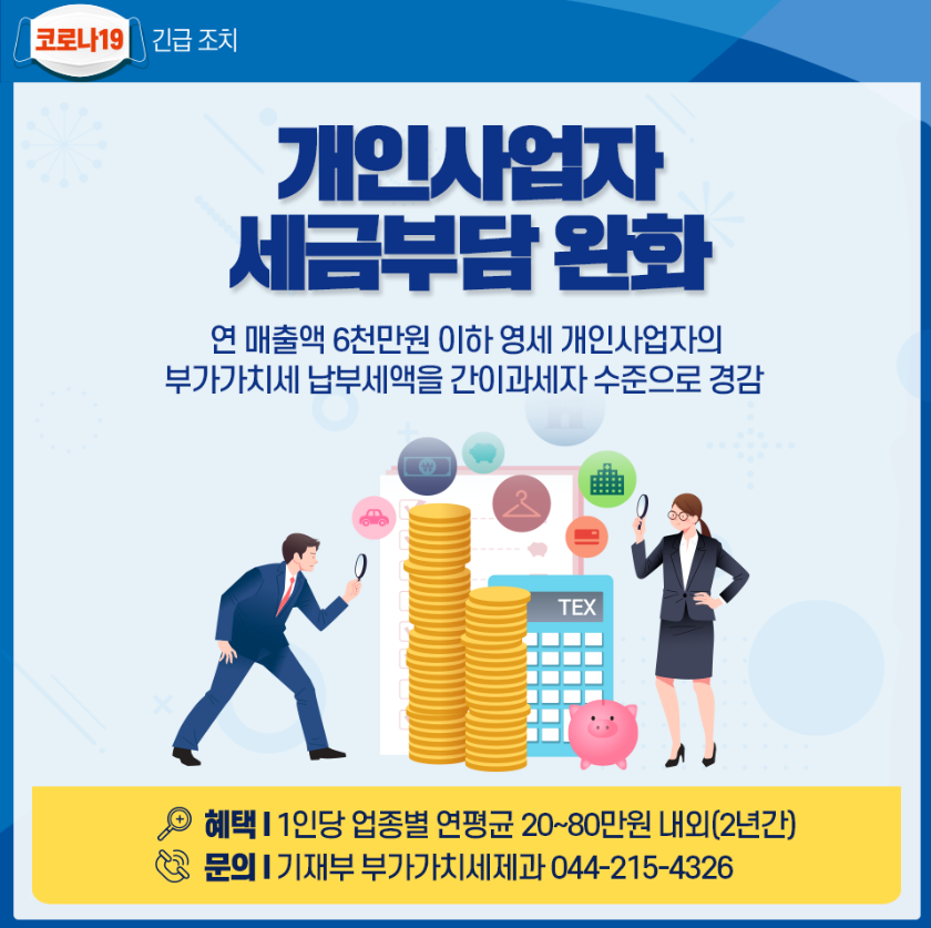 - 연매출액 6천만원 이하 개인사업자의 부가가치세 납부세액을 간이과세자 수준으로 경감시킵니다.