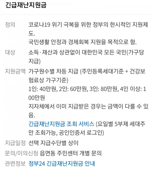 긴급재난지원금이란 코로나19 위기 극복을 위한 정부의 한시적인 지원제도입니다. 또한 1인 40만원, 2인 60만원, 3인 80만원, 4인이상 100만원 지자체에서 지급받을수 있습니다.