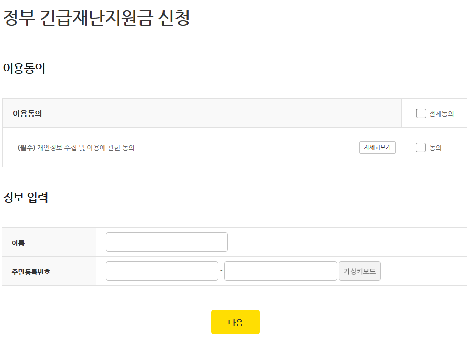 - 새대주의 이름과 주민번호를 입력하고 다음을 눌러주세요.