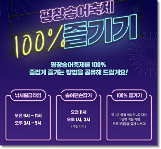 첫눈이 오고 쌀쌀해지는 날씨가 지속되네요 이제는 추운겨울이 성큼 다가왔습니다. 그래서 겨울축제 소식을 알려드리려고 하는데요 한번쯤은 꼭 가봐야할 겨울축제 중에 하나인 평창송어축제 입니다. 평창군 진부면에서 매년 개최되는 행사로 겨울마다 열리는 축제랍니다. 송어낚시와 썰매체험 등 다양한 체험 프로그램과 함께 진정한 겨울축제를 즐길수 있도록 살펴보도록 하겠습니다.