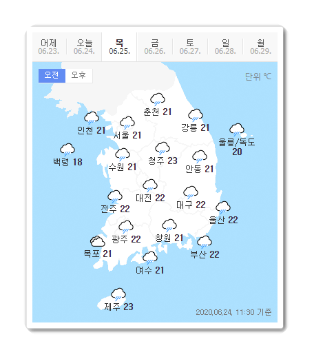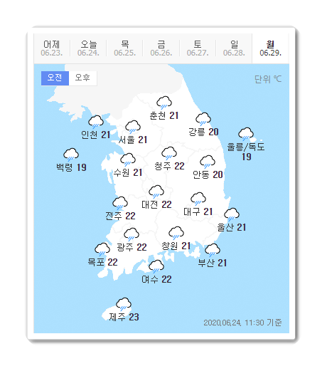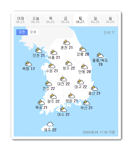 이날 24일 아침 예상 최저기온은 △서울 23도 △대전 22도 △광주 22도 △부산 21도 △대구 21도 △춘천 22도 △제주도 23도 등이며, 낮 예상 최고기온은 △서울 24도 △대전 25도 △광주 24도 △부산 26도 △대구 27도 △춘천 24도 △제주도 27도 입니다.