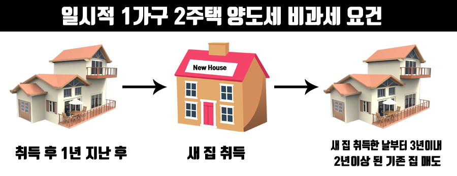 1채의 주택을 가진 1가구가 그 집을 구입한 날부터 1년이상 지난 후 새로운 주택 추가 구입하여 일시적으로 2주택이 된 경우 새로운 주택 구입한 날부터 3년이내에 2년이상 보유한 종전의 주택 양도시 비과세
