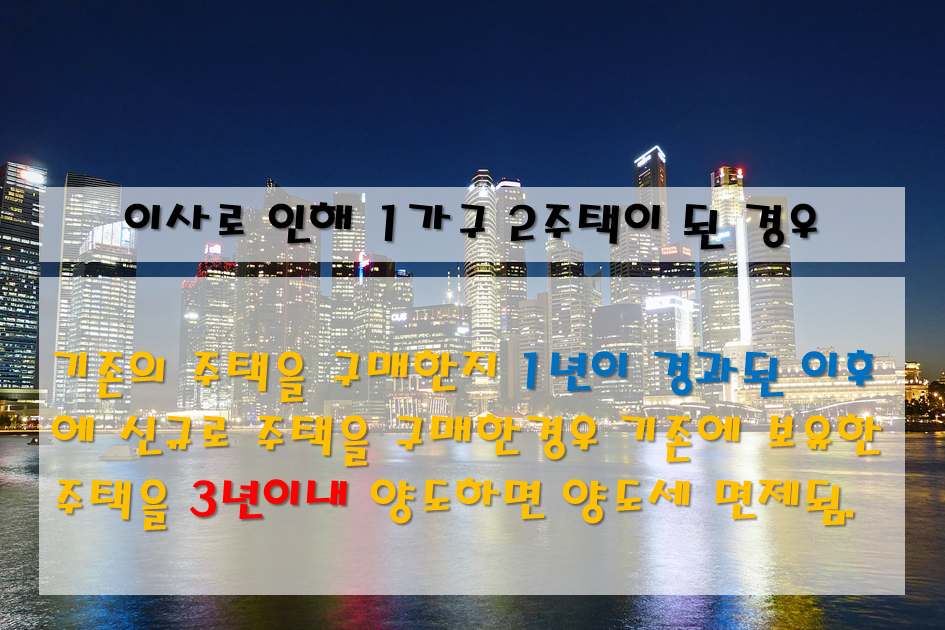 하지만 살다보면 뜻하지않게 2주택을 소유하게되는경우도 많아 혹시 나도 세금을 많이물게되는것은 아닌가하고 걱정하시는분들이 의외로 많은데 1가구 2주택자라고 하더라도 기존에 소유하고있는집을 나중에 구입한집보다 먼저 매도를 하게되면 일정요건 충족시 양도세면제를 받을수있습니다. 이에 대해서 알아 보겠습니다.