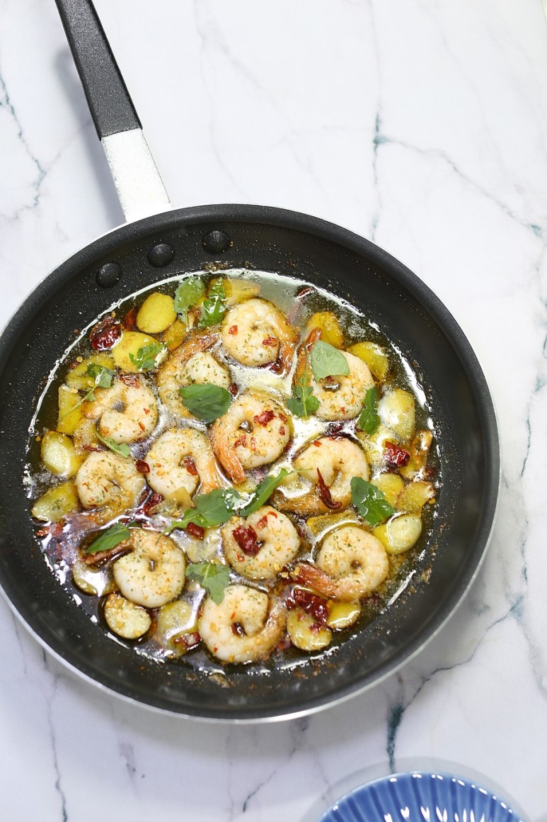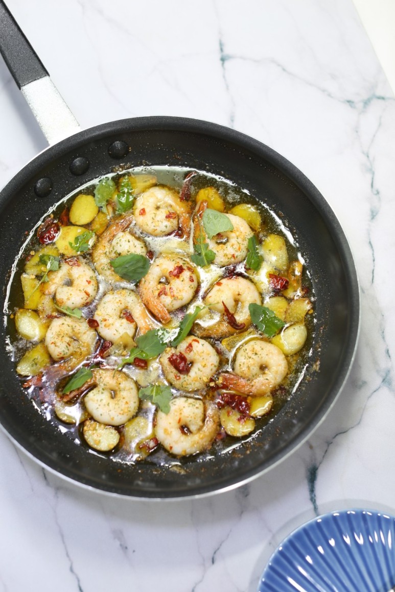 ⑤ 마늘과 페페론치노를 먼저 넣고 향을 낸 후 새우를 넣으면 새우가 익는 동안 발연점이 낮은 올리브오일에 마늘과 페페론치노가 타더라구요.