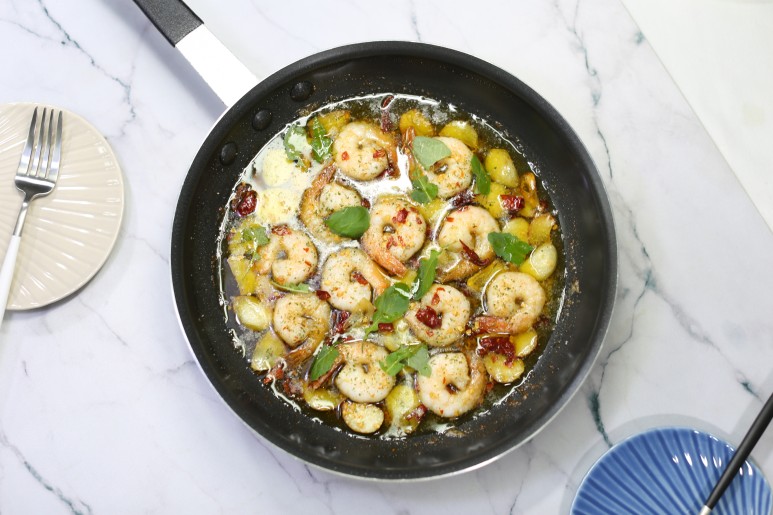 ④ 팬에 올리브오일을 붓고 예열을 해줍니다. 일반적으로 편 썬 마늘과 페페론치노를 먼저 넣고 튀겨 마늘과 페페론치노 향을 내준 뒤 새우를 넣고 익히는데 오늘은 새우를 먼저 넣고 반쯤 익힌 뒤 마늘과 페페론치노를 부셔 넣었어요.