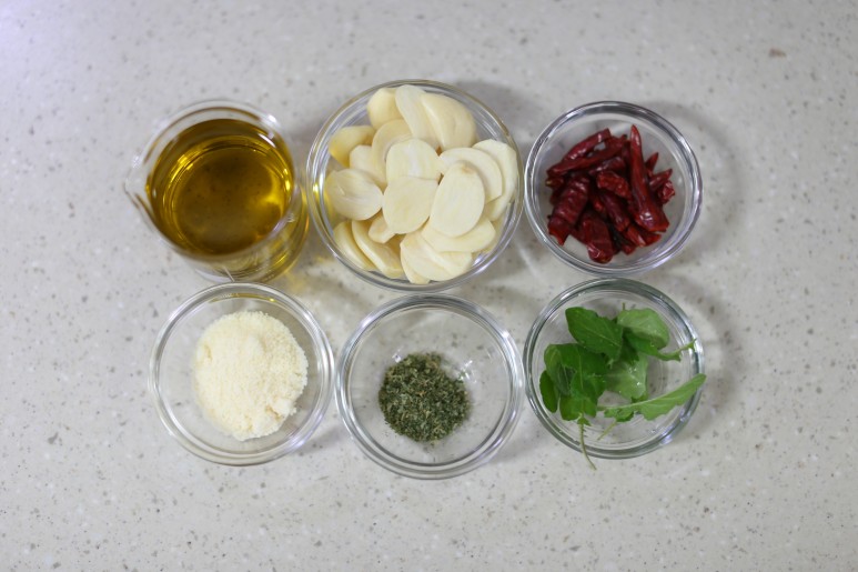 ① 냉동 칵테일새우, 올리브오일, 통마늘, 페페론치노, 파마산치즈를 준비합니다.