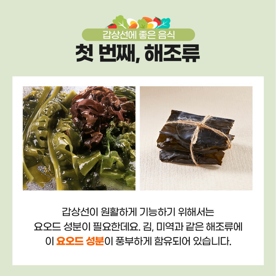 갑상선이 원활하게 기능하기 위해서는 요오드 성분이 필요합니다. 요오드는 김, 미역과 같은 해조류에 풍부하게 함유되어 있는데요. 비교적 우리나라 사람들은 김과 미역 등 섭취량이 많은 편이라 요오드 결핍 현상일 가능성은 적지만 평소 거의 해조류를 섭취하지 않았다면 해조류를 식단에 함께 구성해서 섭취해주는 것이 좋습니다.