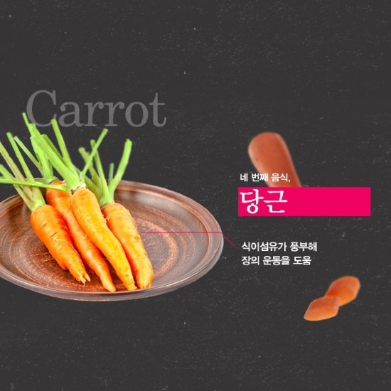 네번째, 당근에는 식이섬유가 풍부하게 함유되어 있어 장운동을 도와주며, 장의 기능을 정상적으로 도와주는 비피더스균 생성 조력자인 비피더스 인자가 있어 변비 등의 기능성 장 질환에 도움이 됩니다.