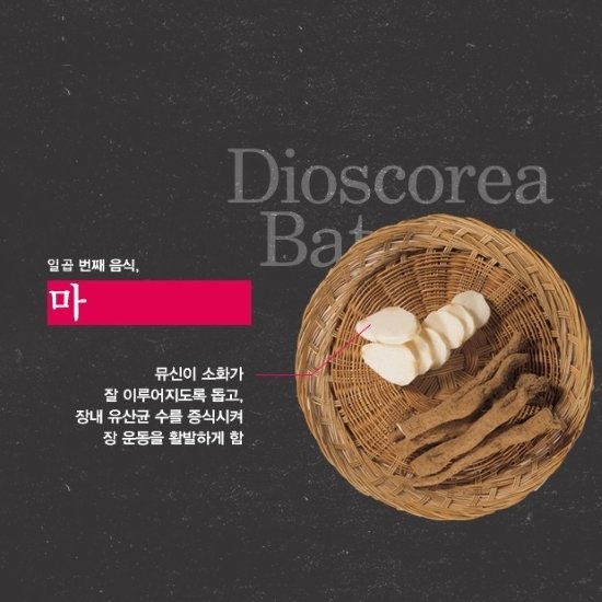 일곱번째, 마의 끈적거리는 물질인 뮤신은 소화효소가 풍부해 소화가 잘 이루어지도록 돕고, 장 내 유산균 수를 증식시켜 장의 운동을 활발히 해 장을 건강하게 만들어주며 변비 해소에도 효과적입니다.