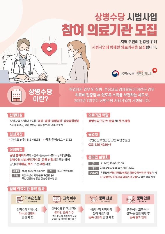 상병수당을 신청하려는 사람은 이들 의료기관으로부터 1만5천원의 비용을 내고 상병수당 신청용 진단서를 발급받아 제출해야 합니다. 발급 비용은 신청인이 수급대상으로 확정되면 환급되며, 시범사업 참여 의료기관 명단은 건강보험공단 홈페이지에서 확인이 가능합니다.