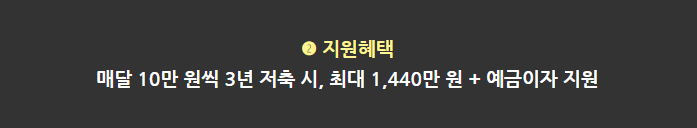 본인 적립액 월 10만 원에 정부 지원금 월 10만 원을 추가 적립하여 3년간 지원하며 만기 시에는 본인 납입액 360만 원을 포함하여 총 720만 원의 적립금과 예금이자 수령할 수 있습니다.