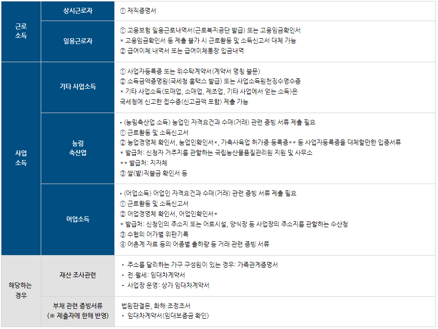 (사업자)도 근로자와 똑같이 적용하며, 소득확인을 위한 증빙서류도 사업 유형에 따라 다르므로, 증빙서류 확인 후 제출하여야 합니다.