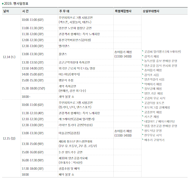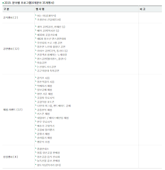 - 주요 행사 : 전국곶감가요제/송어잡기 체험/감깍기 체험/청소년 댄스경연대회/메추리구워먹기/양촌곶감판매장 운영