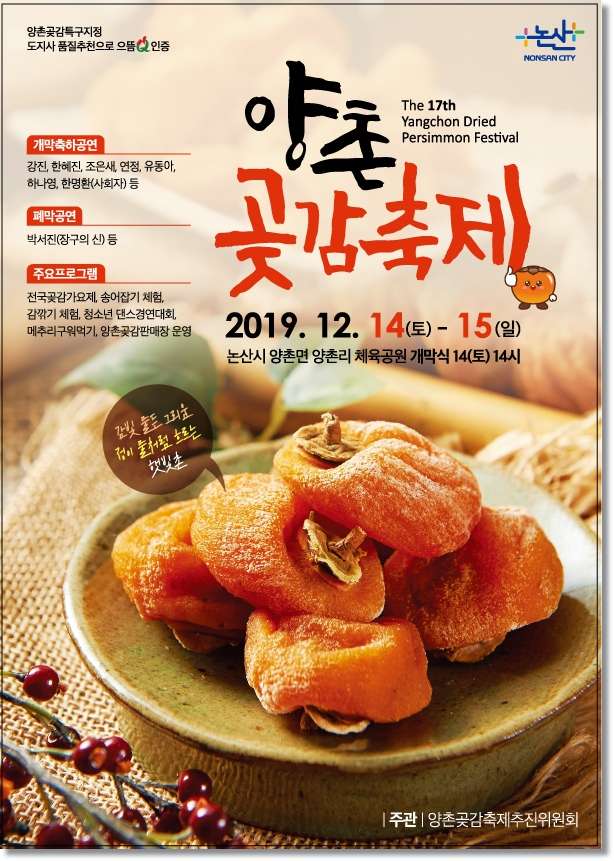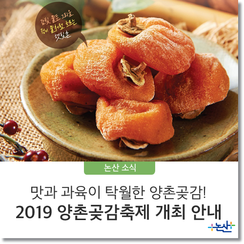 겨울철이 제철인 곶감은 천혜의 자연조건으로 높은 품질을 자랑하는 양촌곶감, 구슬땀을 흘리며 덕장에 곶감들로 아름다운 전경을 수놓은 곶감농가들, 그 결실을 맺어가는 계절 12월 우리를 찾아옵니다. 충남 논산시에서 2006년 곶감특구 지정, 충청남도지사의 품질인증 Q마크 획득, 한국일보 주최 2008 대한민국 우수특산품 대상 선정등으로 청정지역의 지역특산품의 양촌곶감의 우수성은 이미 널리 인정된 바있습니다. 또한 양촌의 아름다운 강과 산으로 어우러진 양임교 논산천둔치에서 개최되는 양촌곶감축제는 다양한 볼거리, 먹을거리, 즐길거리 등으로 눈과 귀와 입을 즐겁게 하는 축제로 다양한 프로그램을 선보입니다.