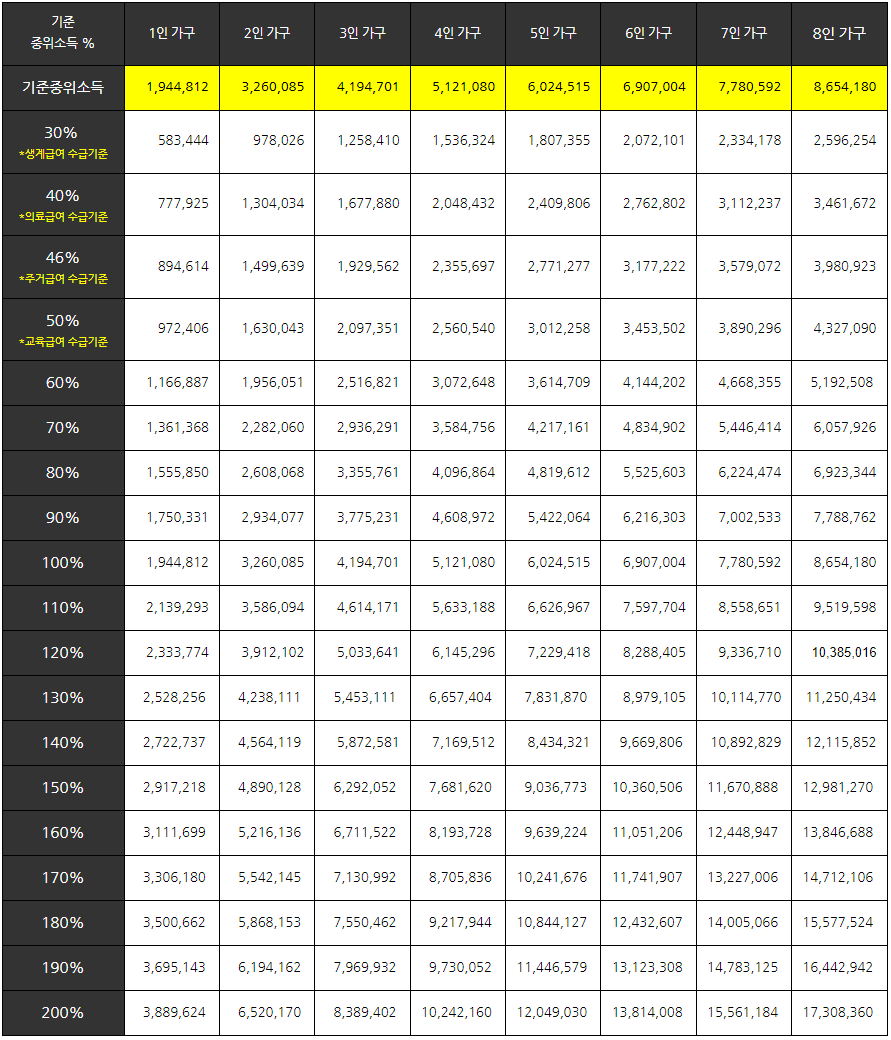 중위소득은 전체 가구를 소득 순서대로 세웠을 때 중간에 위치한 가구의 소득을 말합니다.