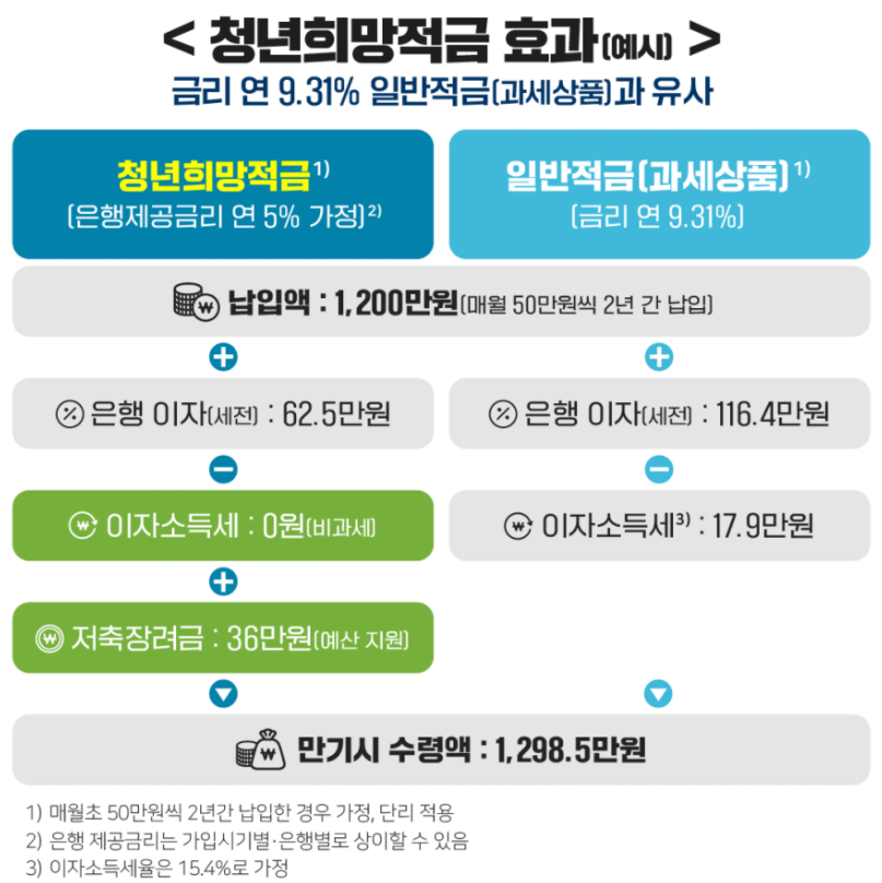 | 납입액 : 1200만원(매월 50만원씩 2년 간) + 은행이자(세전) : 62.5만원 - 이자소득세 : 0원 + 저축장려금 : 36만원 = 만기시 수령액 = 1298.5만원 |