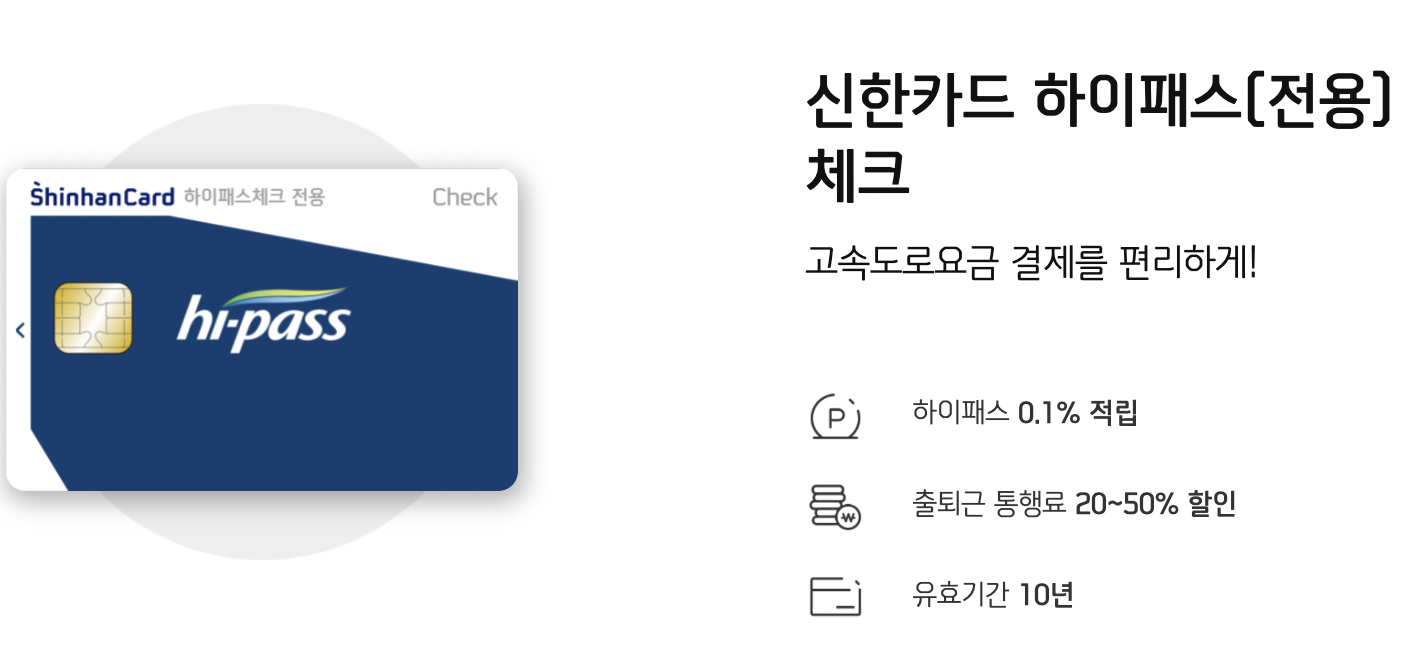 신한카드 하이패스(전용) 체크 카드는 후불 하이패스카드로 고속도로 톨비를 이용하고 약 2주뒤면 자동으로 연결된 계좌에서 출금이 됩니다. 그래서 따로 충전을 할필요가 없어서 선불 하이패스카드보다 사용이 편리합니다. 최초 발급비가 5,000원이 발생합니다. 연회비가 없어서 장점이 많은 하이패스 카드입니다.