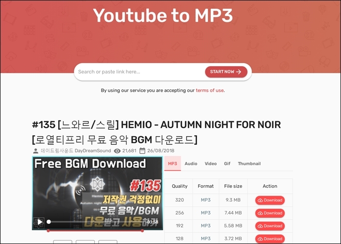 | 제목의 링크 클릭을 통해 해당사이트로 바로 이동 가능합니다.아래 사이트 모두 유튜브 영상을 MP3로 변환하는온라인 서비스의 사용법은 아래와 같이 유사합니다. |