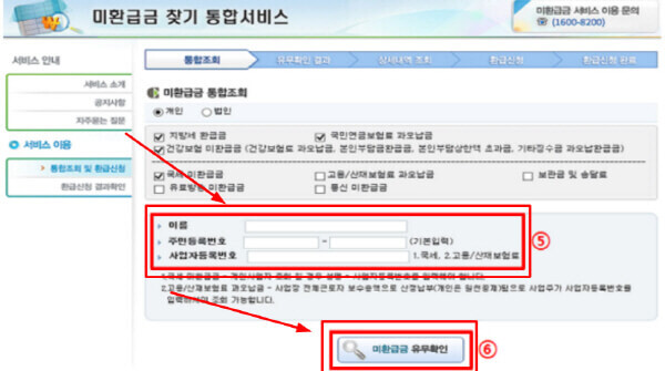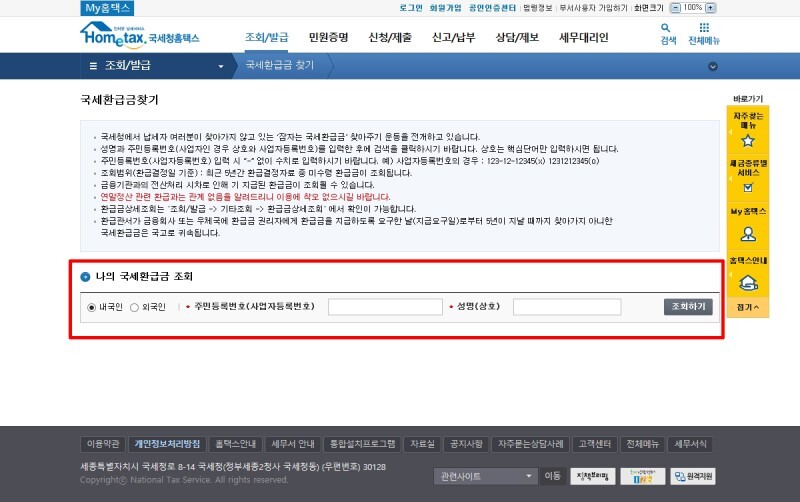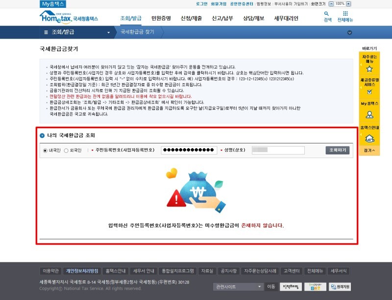 사업자등록 번호나 주민 등록 번호를 입력하시고 성명을 입력하시고 미환급금 유무를 확인