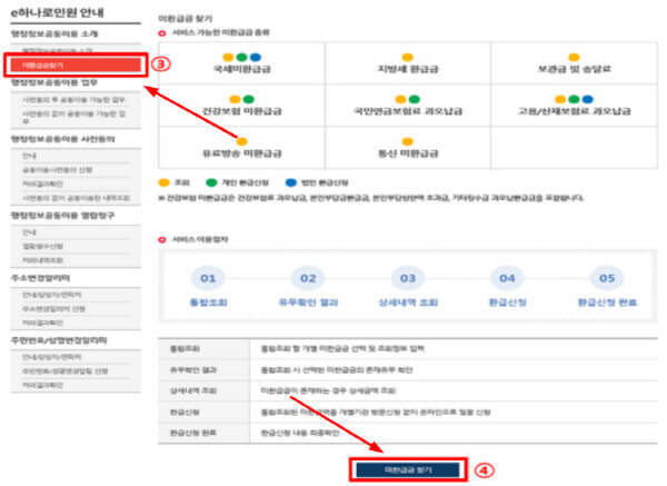 왼쪽에 있는 메뉴에서 미환급금 찾기 탭을 선택