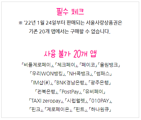 - 사용처 : 온라인 전용 [11번가(e서울사랑샵#), 제로배달유니온(위메프오, 땡겨요, 먹깨비, 맘마먹자, 로마켓)]