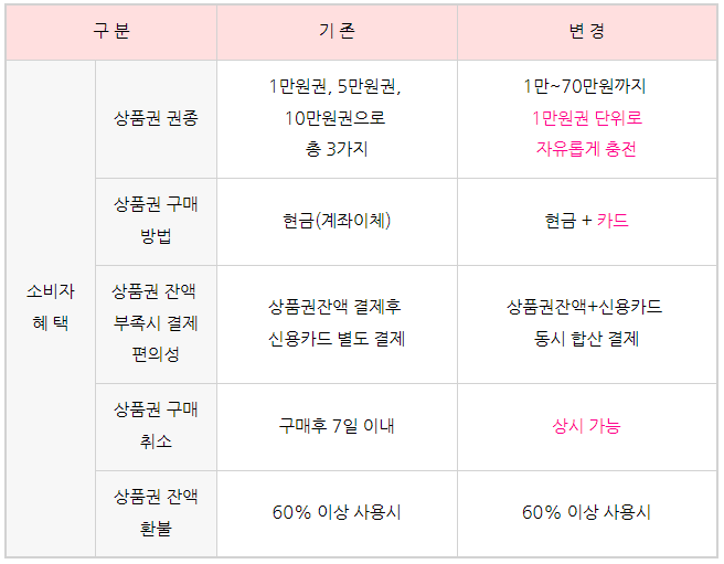 구매는 1만 원, 5만 원, 10만 원 3종류로 구매가 가능하며 할인율 10% 혜택이 주어집니다.