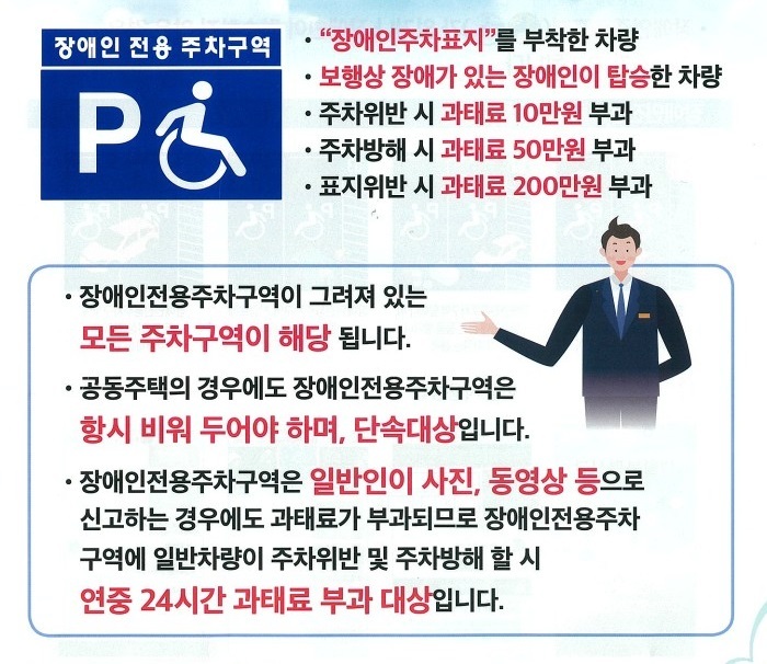 장애인전용주차구역이 그려져 있는 모든 주차구역 해당됩니다. 공동주택의 경우에도 항시 비워 두어야 하며, 단속대상입니다. 또한 연중 24시간 과태료 부과 대상으로 일반인이 사진 동영상 등으로 신고시 과태료가 부과 됩니다.