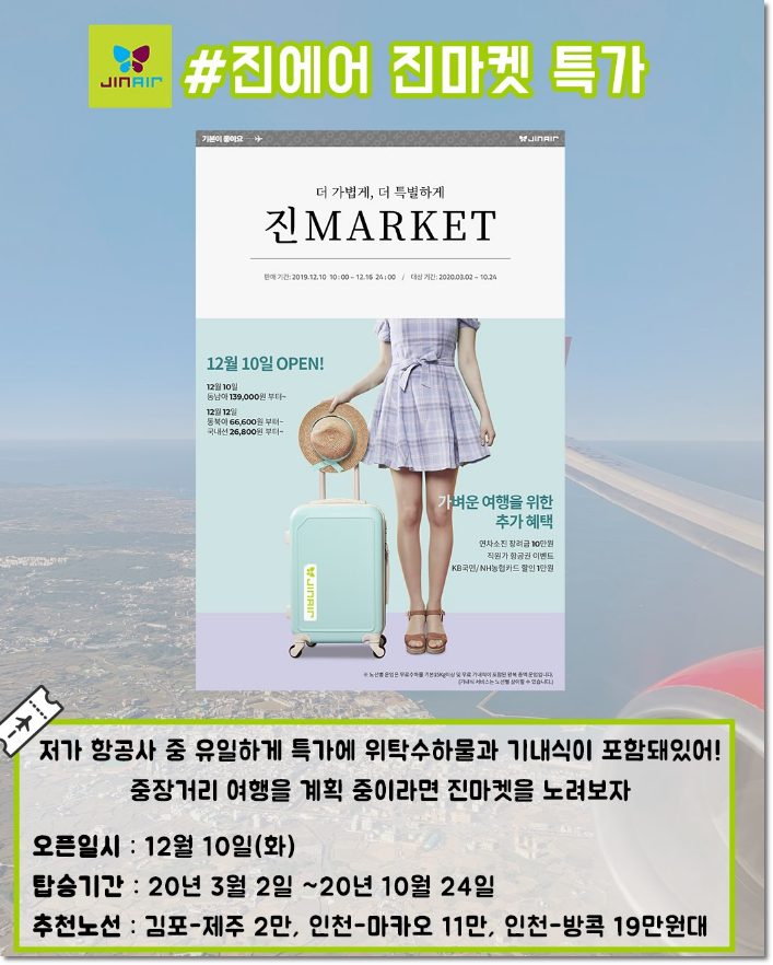 진에어 진마켓은 국내 저가항공사에서 큰 이벤트를 진행하는데 그중 가장인기 있는 곳입니다. 다른 항공사는 위탁수하물이 불포함인데 진에어는 기내수하물 12kg으로 타 항공사에 비해 기준이 넉넉한테 위탁수하물까지 포함되고, 심지어 기내식도 줍니다. 타항공사는 위탁수하물 불포함이라 편도기준 5~8만원, 왕복 10~16만원이 더 비싸지기 때문에 위탁수하물 포함이라는 어마무시한 혜택이 있습니다.