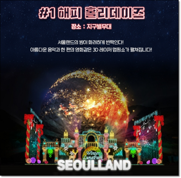 과천에 있는 서울랜드 겨울 빛축제 [루나 해피 홀리데이즈]는 서울에서 가장 가까운 빛 축제로서 매일밤 서울랜드의 28만2250㎡의 넓은 공간전체를 거대한 빛으로 공연장으로 새롭게 변신해서 환상적인 분위기의 라이트닝 공연이 펼쳐집니다.
