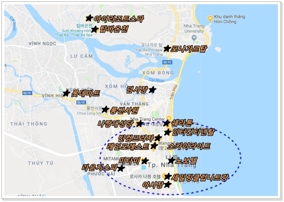 이렇게 지도로 보기 좋게 정리하면 어디를 둘러봐야할지 어디가 유명한 관광지가 있는지 알고 가면 시간을 알뜰하게 쓸수 있고 볼것도 즐길것도 많습니다. 베트남어로 나(Nha)는 집, 트랑(Trang) 은 하얗다라는 뜻으로 하얀 모래언덕이