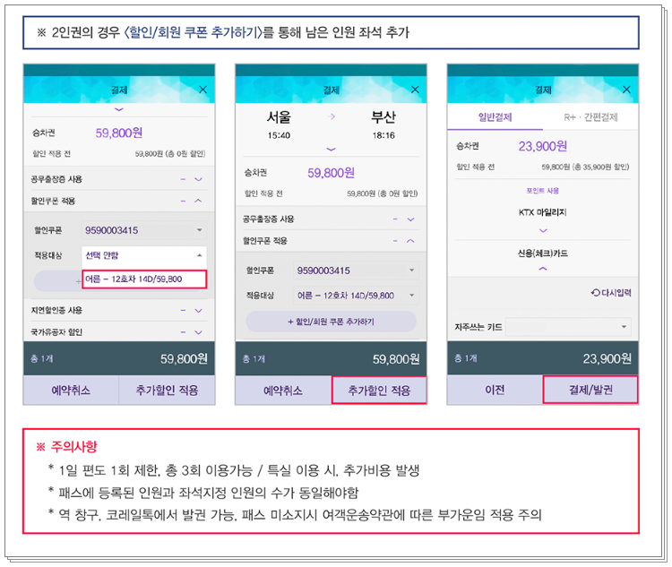 좌석을 지정 받고 싶다면 KTX, ITX-새마을, 새마을호, 누리로, 무궁화호, 관광전용열차 좌석 지정시 일반실 운임의 60% 할인된 가격으로 구매가능하며, 하루 편도 1회씩 총 3회까지 가능합니다. 단, 평일에만 가능하며 주말이나 공휴일은 좌석 지정 혜택을 받을 수 없습니다. 또, KTX의 경우 좌석 매진시 자유석 운임의 60%할인된 가격으로 입석이나 자유석 승차권 구매후에 이용 가능합니다.
