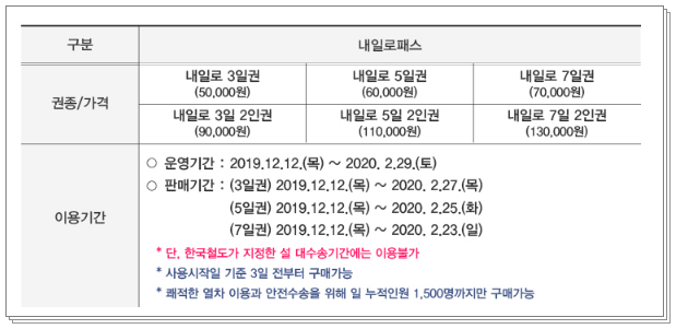 내일로 티켓 이용 기간은 2019.12.12 ~ 2020.02.29일 까지입니다. 사용 시작일 기준 3일 전부터 구매가 가능합니다. 단, 쾌적한 열차 이용을 위해 하루 누적인원 1,500명까지 구매가 가능합니다. 설 연휴와 그 앞뒤로 몇일 정도의 설연휴 대수송 기간에는 이용이 불가능 하니 참고하시기 바랍니다.