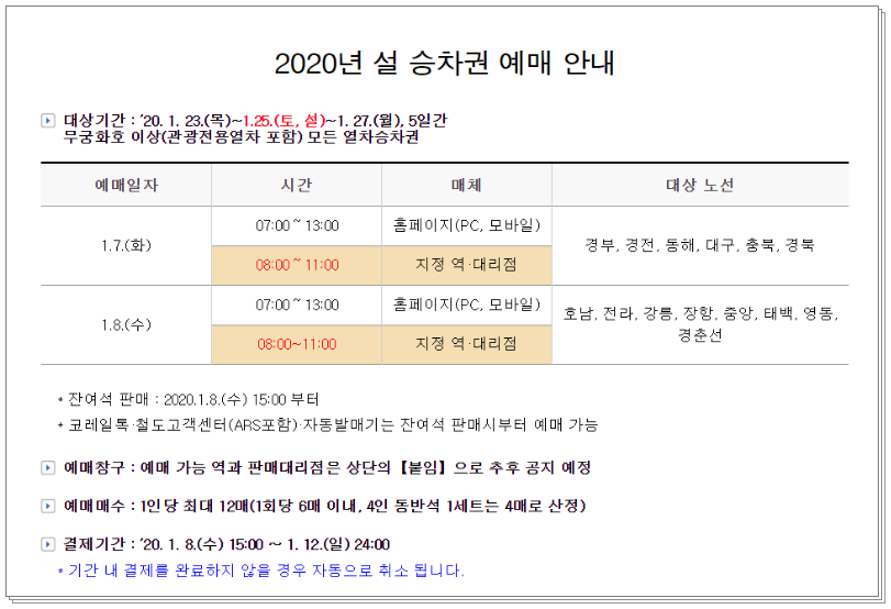 2020년 설날 기차표 예매는 노선별로 예매날짜가 다릅니다. 노선 총 14개 노선으로 나눠어져 있으므로, 가는 지역이 어디 노선인지를 정확히 알고 예매를 하셔야 합니다. 그리고 설날이기 때문에 매수 수량 제한이 있습니다. 1인당 최대 12매까지만 예매가 가능합니다. 1회 6매 이내, 4인 동반석 1세트로 예매하면 4인이기 때문에 4매로 산정된다고 하니 확인하시길 바랍니다.