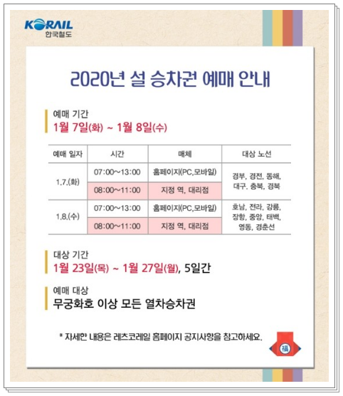 2020년 설날은 미리 체크하셔서 원하는 시간에 가족과 함께 기차로 편안하게 고향 다녀오시기 바랍니다. 2020년 경자년 새해 복 많이 받으세요^^