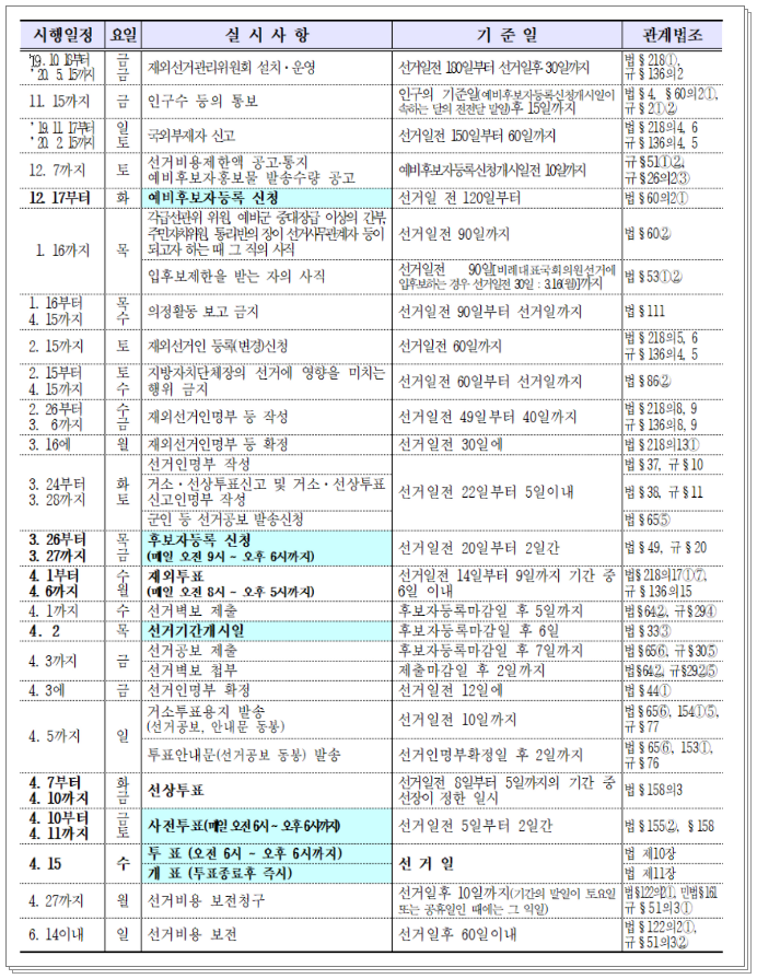 2020년 총선은 이미 19년 10부터 시작했다고 보시면 됩니다. 물론 선거는 아니고 예비후보 등록부터가 이미 시작되었습니다. 실제로는 2020년 4월 15일에 실제 투표를 하는 선거 날짜입니다. 사전투표는 4월 10일, 11일 입니다. 내년에 뽑게 되는 국회의원 전부를 선출하기 위해 많은 분들이 고생이 시작되겠습니다. 총선은 4년마다 진행이 됩니다.