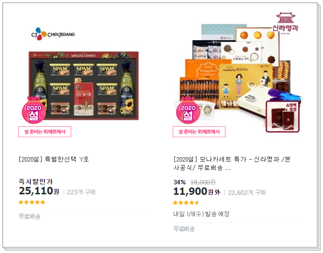 가공식품은 명절선물로 유명합니다. 또한 회사에서 명절에 꼭 주는 선물세트 중 하나입니다. 대부분 회사에서 참치나 식용유, 스팸등 들어있는 선물세트로 주고는 합니다. 친척끼리도 가공식품으로 선물을 주고 받기도 합니다. 가공식품은 기한이 길기때문에 미리 준비해서 설명절에 드리기도 하고 오래두고 먹을수 있다는 장점이 있습니다.