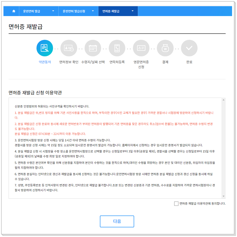 ③ 면허증 재발급 신청 이용약관 확인후 동의 체크 후 다음