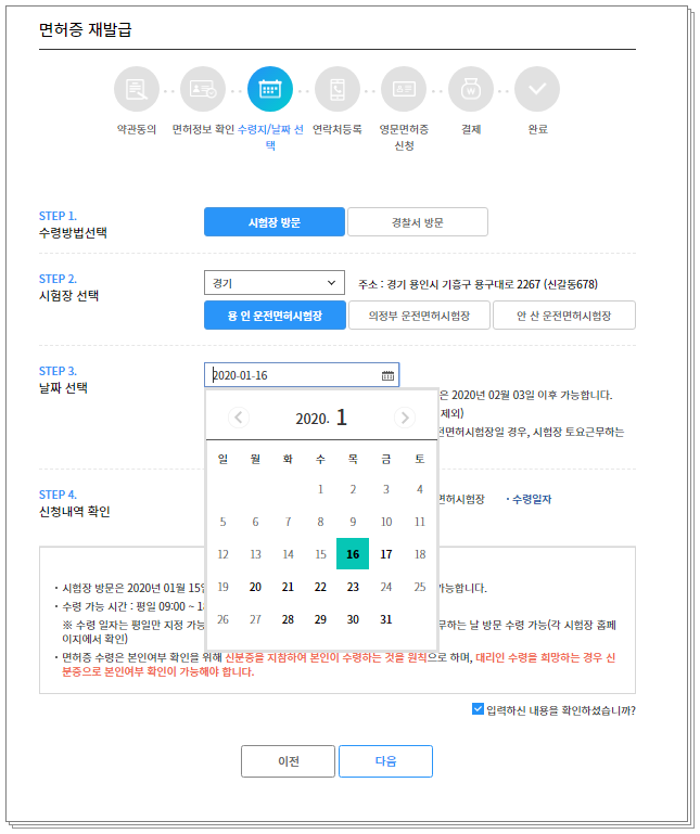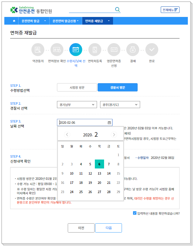 ⑤면허증 수령방법 선택 시험장 방문 or 경찰서 방문 -> 지역 선택 -> 날짜 선택 -> 다음