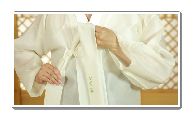 ① 오른쪽 짧은 고름을 왼쪽 긴고름위에 올려주세요