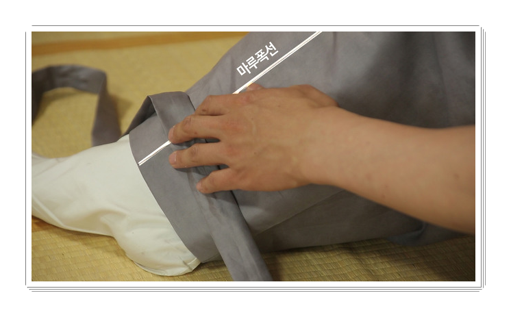 ② 바짝 당깅상태에서 왼쪽으로 접고 허리끈을 매 주세요