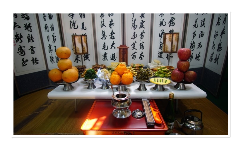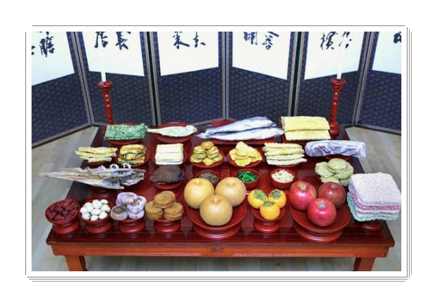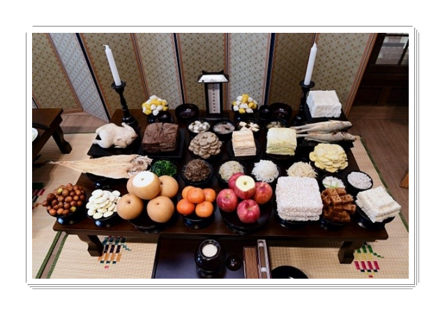 5열 과일,과자 : 과일은 양의 수인 홀수로 올리고, 조율이시와 홍동백서를 지켜 서쪽부터 대추와 밤, 배, 곶감, 약과,