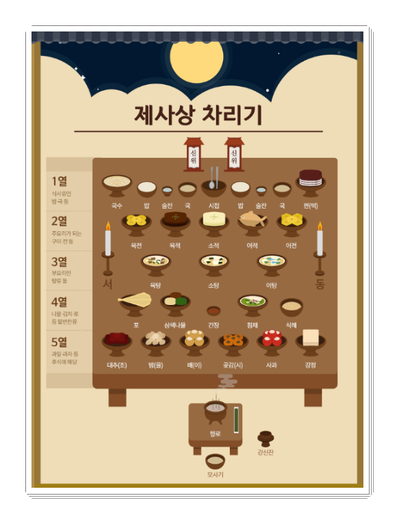 기본적으로는 제사상은 5열로 차리게 되어 있습니다. 벼풍에서 가장 가까운 곳을 1열, 2열, 3열, 4열, 5열로 봅니다. 제사상 차리는 방법을 알아 보겟습니다.